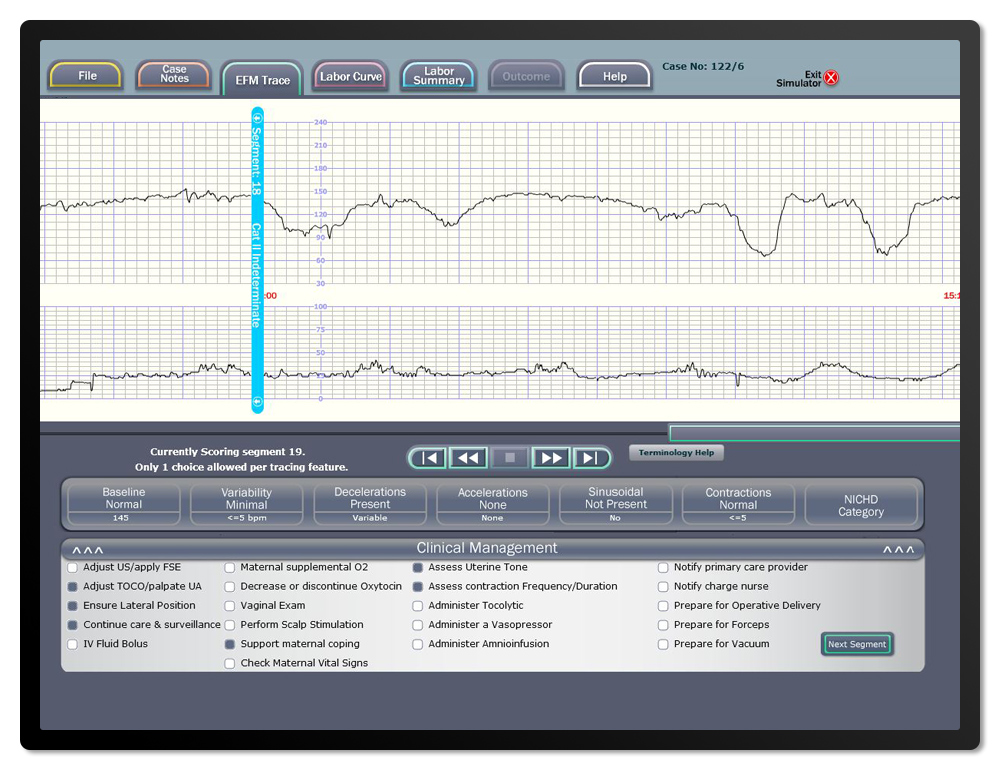 The case reviews mimic what happens at bedside with interactive tracings that progress over time to simulate real-world care. The principles of maternal-fetal physiology are applied in the analysis of fetal heart monitoring case studies while promoting standardized EFM communications using the NICHD terminology. Learning is reinforced with immediate feedback and rationales, as well as numerical scoring compared to expert reviewers.